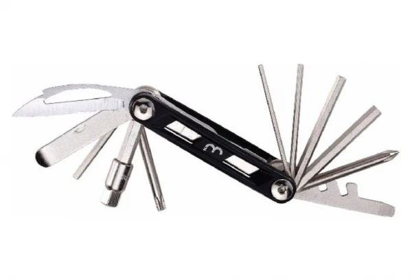 - Clés fonctions: 2, 2,5, 3, 4, 5, 6 et 8mm. Tournevis cruciformes et plats. Torx T25. Démonte-pneu. Clés à rayons. Couteau.