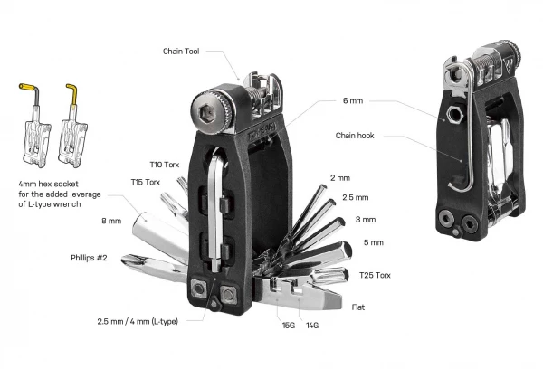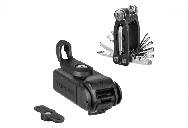 Le multi-outils T16 se monte sous le porte-bidon Ninja avec le support de cage interchangeable ou à utiliser seul avec le support de cadre. Cette boîte à outils résistante aux intempéries contient un mini-outil à 18 fonctions pour les réparations et l’entretien de base.