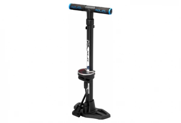 - La stabilité de la pompe à pied XLC est assurée par un pied en plastique, un revêtement aluminium et un corps en acier.